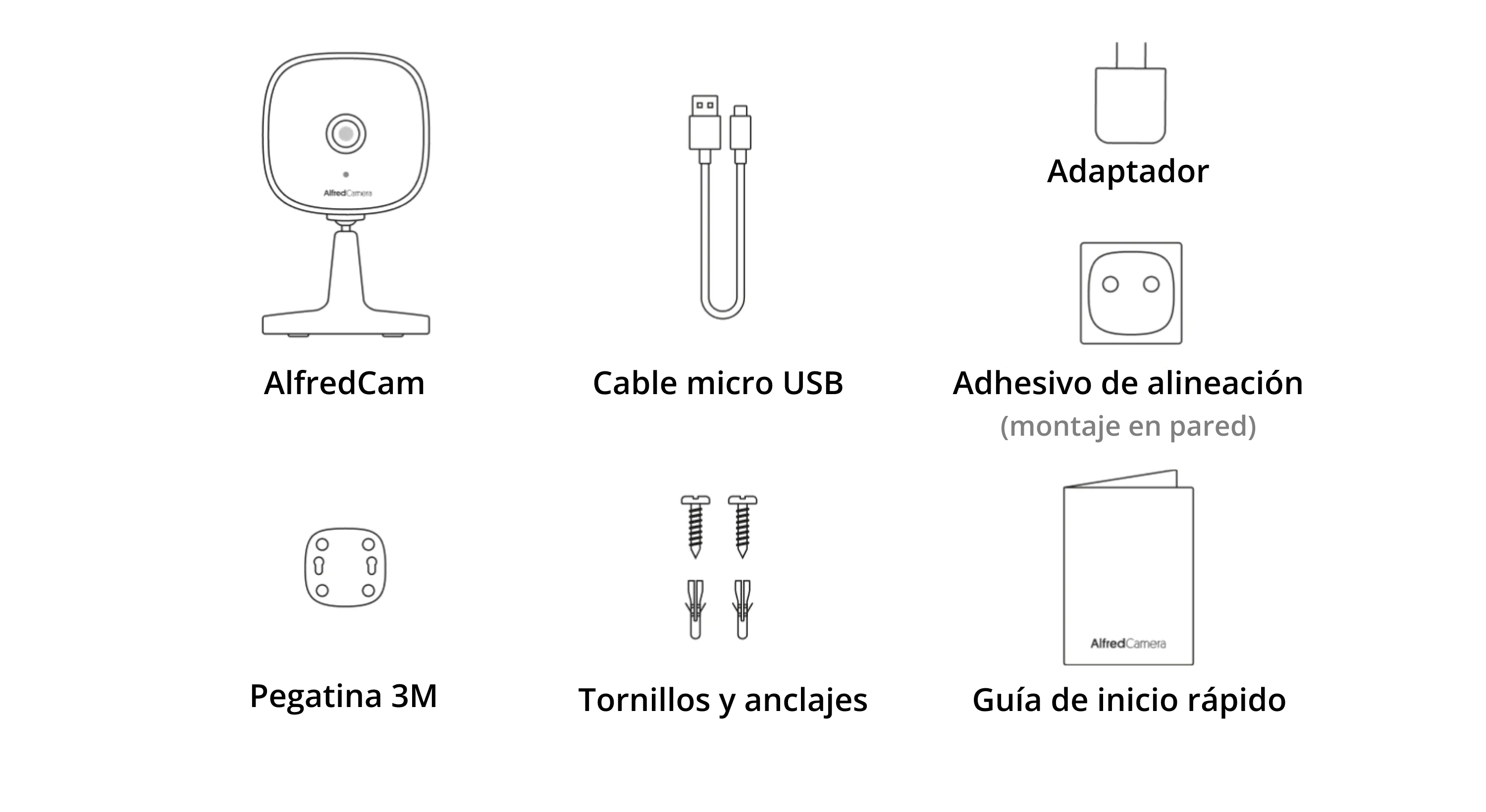 - El paquete incluye: AlfredCam, cable de alimentación interior y adaptador, tornillos y anclajes de pared, adhesivo 3M, guía de inicio rápido